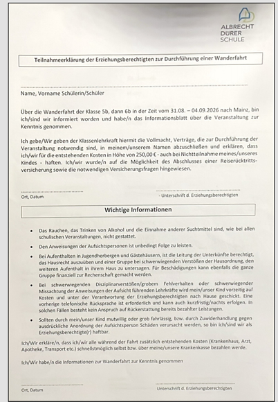 - Achtung: Von einigen Eltern fehlt leider noch die Teilnahmeerklärung zur Klassenfahrt (4.10.2025) teilnahmeerklaerung_klassenfahrt